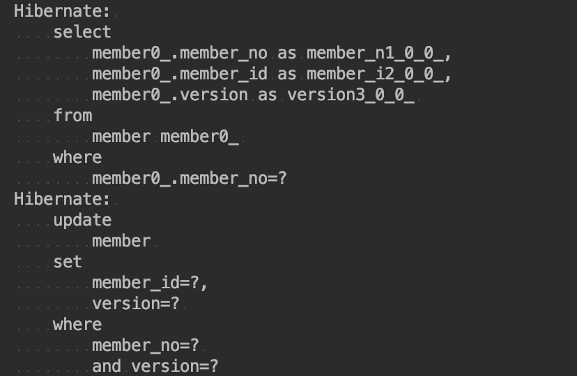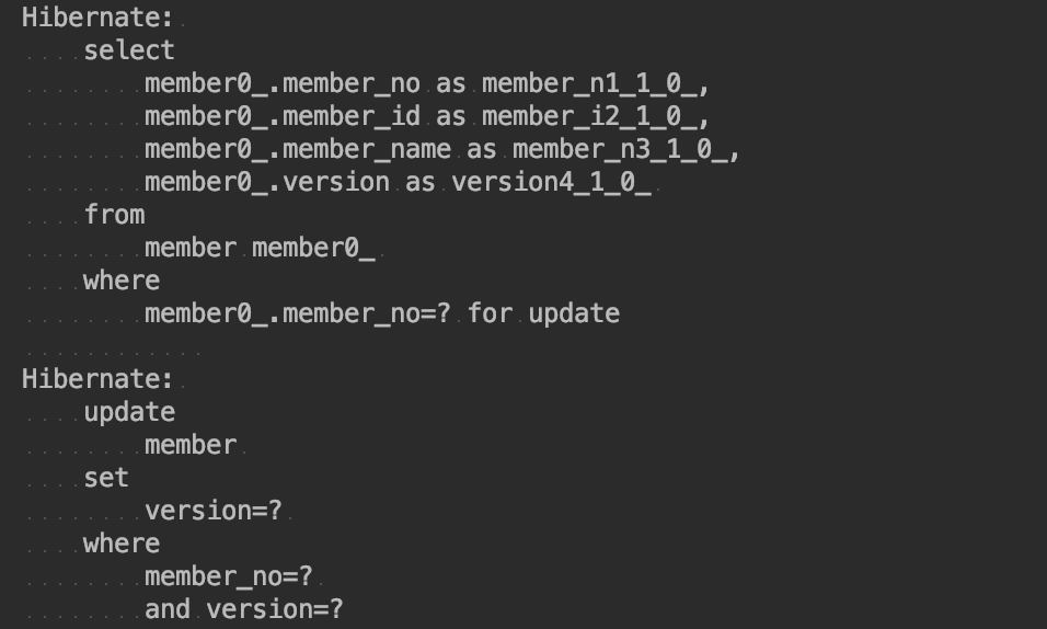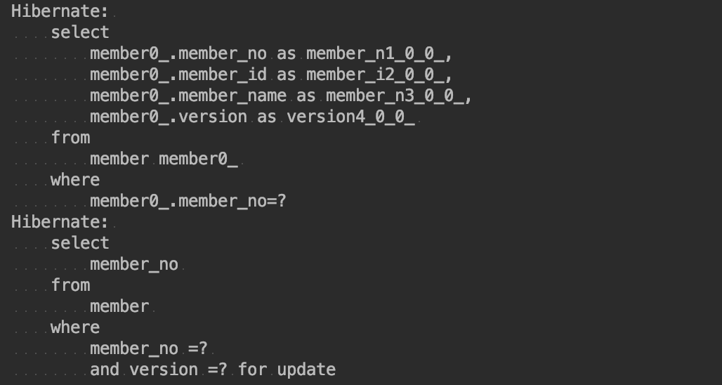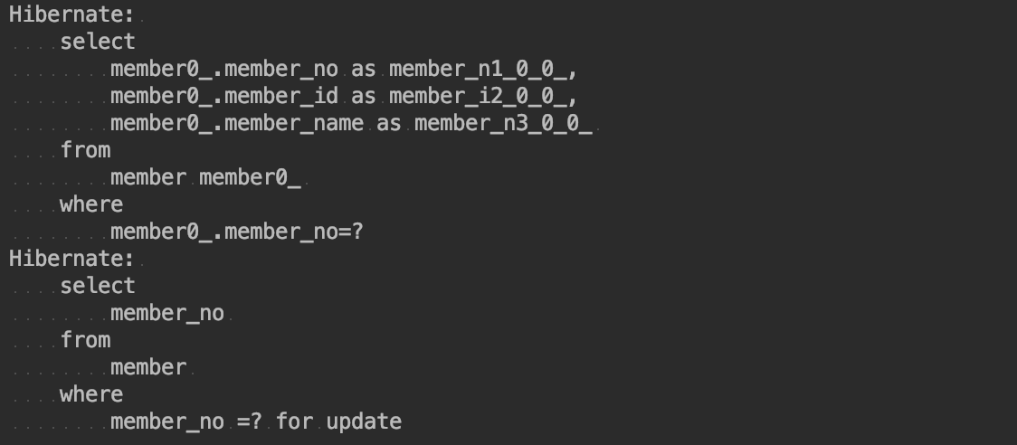위와같이 쿼리문에 엔터티의 Id만 포함된 형태로 락만 취득하기 위한 쿼리가 발행됩니다.