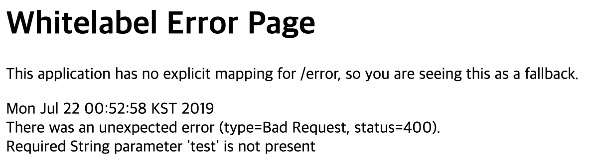 @RequestParam을 지정한 파라미터의 경우 기본적으로 해당 파라미터가 Http 요청에 포함되어야 합니다. 지정한 파라미터가 존재하지 않을 경우 아래와 같이 예외가 발생하고 Http상태코드 400을 반환받게 됩니다.